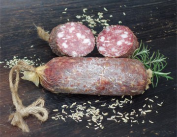 Diese besondere Salamispezialität aus unserem Hause wird mit ausgesuchtem Schweinefleisch hergestellt und mit Fenchelsamen verfeinert.